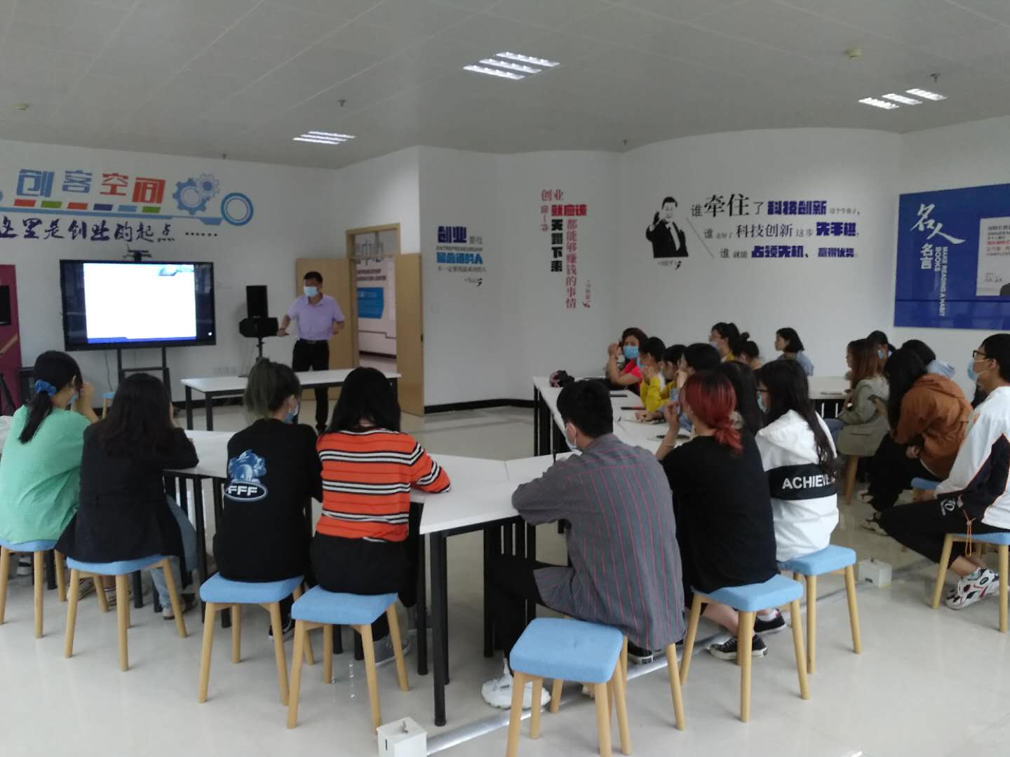 雷蕾介绍了历年“互联网+”创新创业大赛情况,解读了今年大赛政策,强调了报名时的注意事项。俞延文从项目简介、产品与研发、发展战略、财务分析、团队介绍等方面详细讲解了策划书撰写过程,展示了一个完整的项目策划与实施过程。