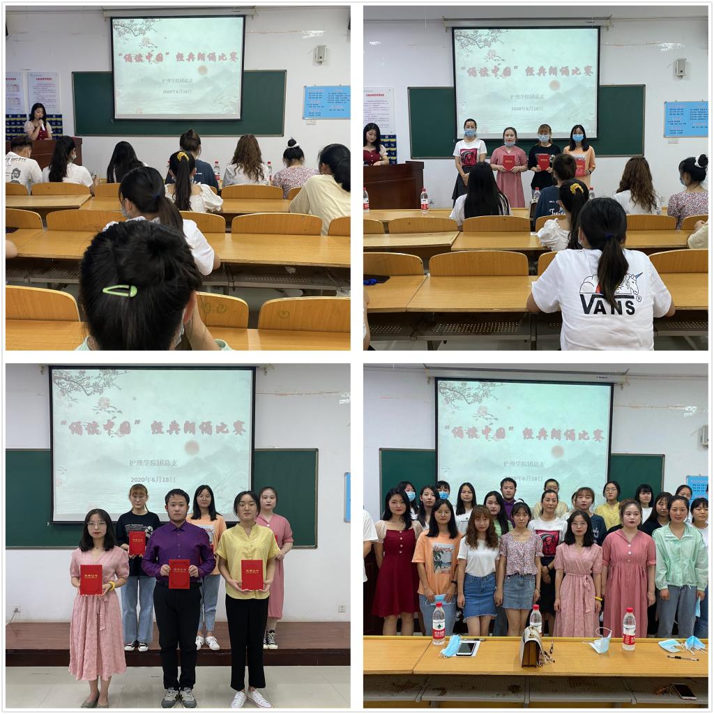 本次比赛由澳门电子pg游戏官网团总支主办。大赛分为预赛和决赛两个阶段,6月13日下午,“诵读中国”经典朗诵比赛预赛从17名选手当中选出6名选手进入决赛。决赛中,参赛选手精神饱满,仪态大方,他们用激昂自豪的声音,表达了他们对祖国文化的热爱和弘扬中华优秀文化的决心。助产高职1901班杨嘉盈以“中国阻击战”为主题,讲述了2020年初的一场突如其来的疫情下,中国所遭受的苦难,讲述了中国精神的伟大和厚重。她吐字清晰,情绪饱满,感染着评委及观众,获得了阵阵掌声,荣获此次比赛一等奖。护理高职1904班许凯睿以“亲爱的北京,你还好吗?”为题,讲述了疫情之下,对北京深沉的爱与祝福,获得了比赛的二等奖;选手护理高职1901班杨倩获得了本次比赛的三等奖。张晶晶、徐文静、贺田欣等同学获得优秀奖。