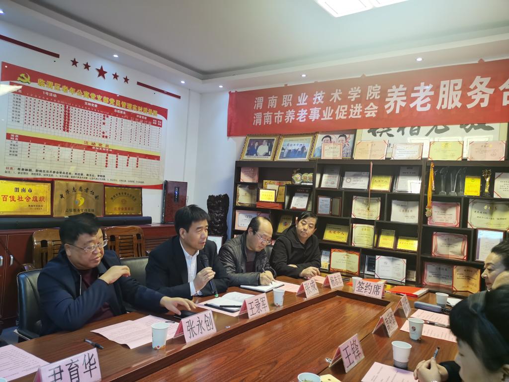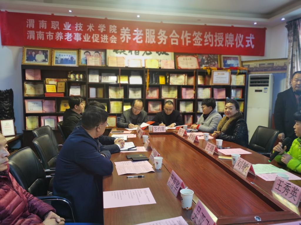 为推动渭南养老服务与管理事业发展,提升我院学生的养老服务能力与素养,12月13日下午,澳门电子与渭南市养老事业促进会在临渭区老年公寓签订了合作协议,并举行了老年服务与管理专业首个校外实训基地挂牌仪式。渭南市民政局副局长张永创、社会福利科科长杨志宏,渭南市养老事业促进会会长王锋、临渭区老年公寓院长黄秀娟,澳门电子副校长王录军、对外交流合作处处长尹育华、澳门电子pg游戏官网院长张成、副院长吴亚飞,老年服务与管理专业带头人任秋爱等出席会议。