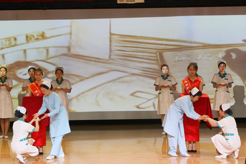 在“送温暖 献爱心”的沙画前,在优美的音乐声中,教师席卫娟、党小丽为优秀护生授帽传灯。护士们庄严的宣誓声将大会推向高潮。