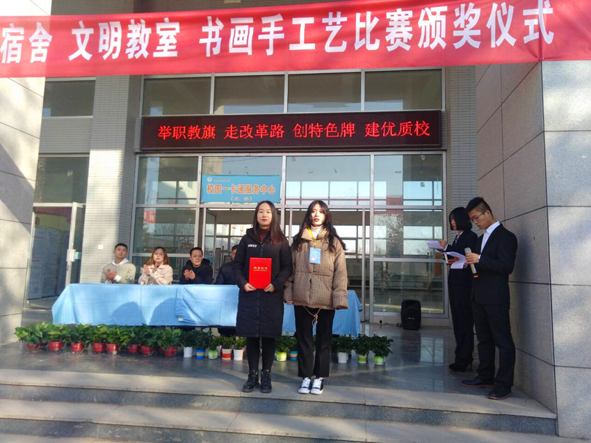 为了创建文明校园,提高我院学生文明素质,弘扬学生创新精神,12月12日下午,澳门电子pg游戏官网在公共教学楼前举办了澳门电子pg游戏官网文明教室、文明宿舍以及手工艺品大赛颁奖仪式。我院学生科科长李博,副科长苏建军,辅导员任鑫老师及百余名学生代表参加此次颁奖仪式。此次颁奖仪式由韩雨柔、黄朝祥主持。