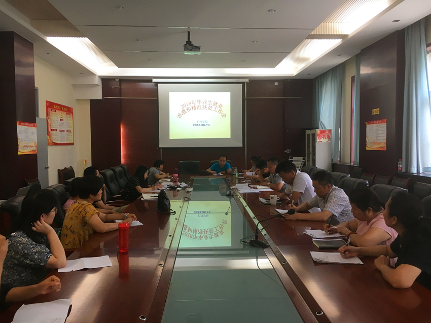 6月13日下午,澳门电子pg游戏官网在医训楼第一会议室召开2018届毕业生就业派遣和精准扶贫工作会议,党总支书记吴运胜、副书记张春兴、学生科科长李博、副科长苏建军、就业办罗彦庆老师及2018届毕业班辅导员、班主任参加了会议。