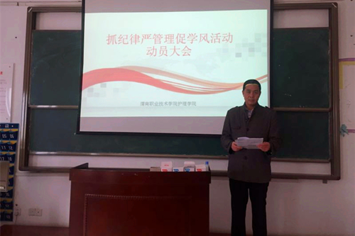 11月8日下午3点,澳门电子pg游戏官网在公共教学楼南楼202教室召开“抓纪律严管理促学风活动”动员大会。澳门电子pg游戏官网院长张文信、副院长王小峰、教学科科长李晓乾及全体一线教师参加此次会议,会议由李晓乾主持。