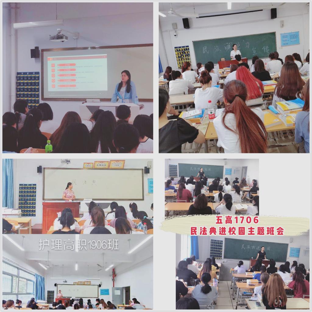 护理五高1801、1802班班主任马淑红通过PPT,向学生宣讲了民法典编撰的重大意义及其亮点,讲解了民法典中物权、合同、人格权、婚姻家庭等基本内容。她希望班级学生认真学习民法典内容,增强自身法治意识,在日常生活中自觉遵守和运用法律知识保护自身合法权益。护理五高1707班班主任孙会娟以“学习中华人民共和国民法典”为主题,带领学生学习合同法、人格权、侵权责任等法典内容,运用身边发生的事例生动地解读了与学生相关的法律法规,帮助学生树立学法、懂法,遵纪守法,依法办事的正确观念。护理高职1906班辅导员韩平以社会校园欺凌事件为引,对校园欺凌的危害和相关法律规定作了引申,向学生讲解了民法典的重要性及其基本内容。她希望学生提高法治意识,降低校园法律风险,维护校园安全稳定。