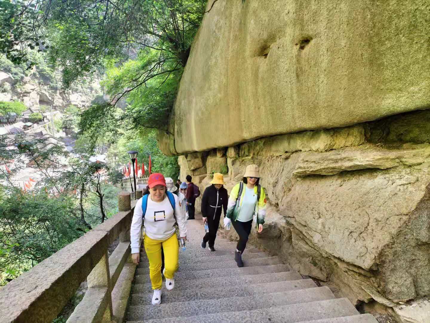 穿越时空精神之旅,触摸烽火岁月印记。在重走智取华山路上,大家沿着当年八勇士的红色足迹拾阶而上,时而奋力攀爬,时而手脚并用,共唱红歌鼓舞士气,用实际行动体验了当年革命先辈钢铁般的意志和不怕牺牲的大无畏精神,全身心地感受“神兵飞跃天险 英雄智取华山”的红色传奇。在征服完全程两公里约4000级台阶后,大家汇聚“解放华山”纪念亭留念。大家兴致勃勃地观看了电影《智取华山》,对八勇士智取华山的英雄事迹有了更加深刻的认识,为他们的机智勇敢、以少胜多、解放华山的英勇无畏精神报以阵阵掌声。