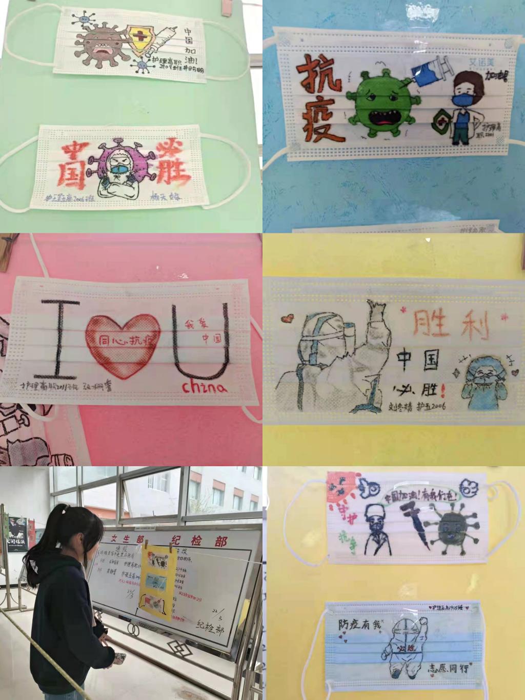 本次活动由团总支组织部主办。活动分为两个环节,组织部策划实施方案,各班同学热情高涨,踊跃参加,发挥想象力,以动漫卡通涂鸦的方式在口罩上呈现出充满想象力的防疫宣传作品,在公共教学楼大厅进行展览,诠释了中国抗疫的决心和医护工作者的信心。