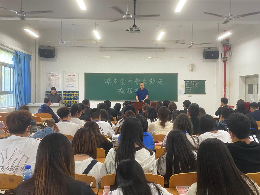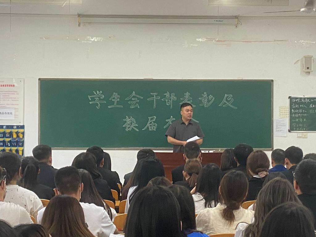 为进一步提高学生的自我管理能力,加强学生干部队伍的建设,5月17日下午,澳门电子pg游戏官网在公共教学楼南楼105室召开了学生会干部表彰及换届大会。澳门电子pg游戏官网学生管理科科长李博,副科长苏建军,5名辅导员及学生代表参加了大会。辅导员李潮主持了会议。