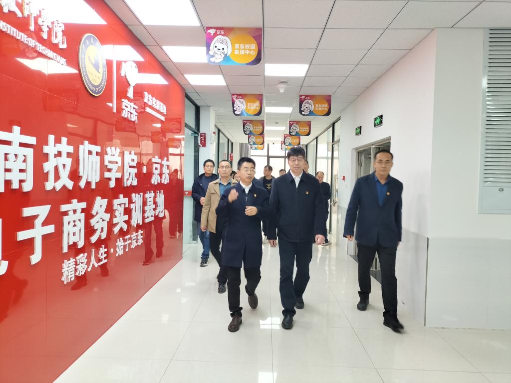 靳华锋一行在技师学院有关领导陪同下,参观了电工技能训练一体化实训室、机电综合一体化实训室、普车加工实训车间实训室、液压与气动一体化实训室、工业机器人理实一体化实训室、数控车加工实训实训室、京东电子商务实训室等教学实训场地。