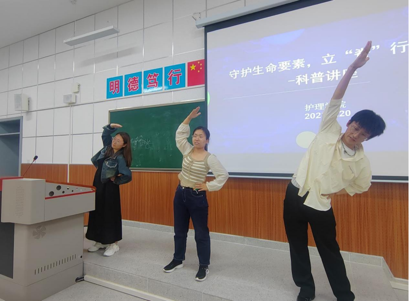 在预防脊柱侧弯的环节中,乔勤峰带领澳门电子pg游戏官网白聪聪、任坤薇老师给同学们进行了预防脊柱侧弯保健操的示范。对保护脊柱的扩胸运动、伸展运动及体转运动进行了详解介绍。