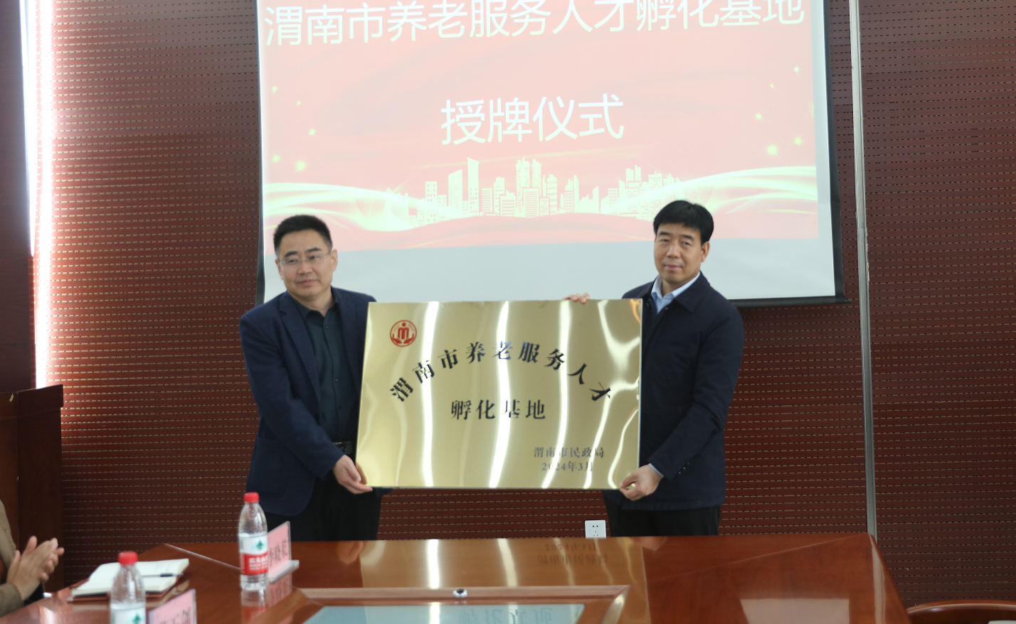 3月22日上午,“渭南市养老服务人才孵化基地”授牌仪式在澳门电子医训南楼第一会议室进行。学校党委副书记王录军,渭南市民政局四级调研员李锋、社会福利科科长杨志宏、科员杨凯及澳门电子医护两院负责同志,各相关部门负责人参加。会议由教务处魏恒处长主持。