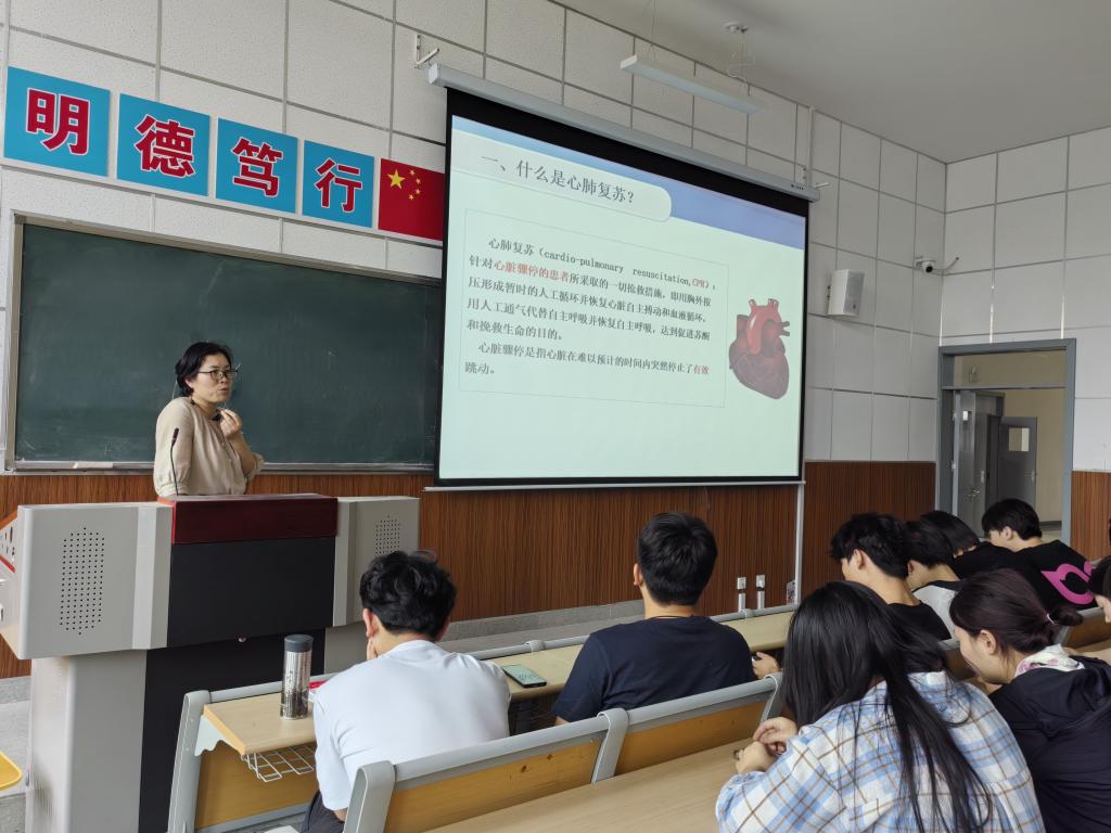 课程围绕“心肺复苏(CPR)”与“意外伤害救护”两大核心主题展开。理论教学中,教师们通过动态流程图解、错误操作警示动画,将CPR的按压深度、频率等抽象标准转化为直观记忆点,现场互动问答不断。在实训环节,通过实训课堂直播与模拟教具联动,同学们分组轮番上手演练胸外按压、人工呼吸等核心技能,智能急救模型的电子屏同步显示按压力度波形图。