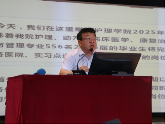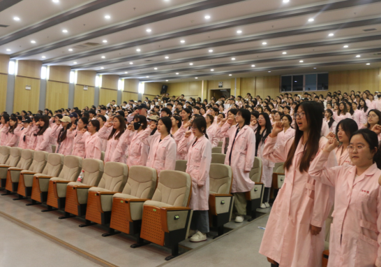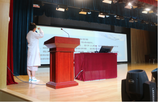 吴亚飞为同学们解读了《职业院校学生实习相关规定》,并结合案例从国家法律法规、顶岗实习标准、学生实习管理规定等层面使学生明确了实习的重要性和相关规范。刘欣为学生详细解读了实习轮转安排、纪律要求、实习鉴定表的填写要求。周梦花为学生进行了实习安全教育,强调了实习期间工作岗位安全、人身财产安全。何宇分析了当前的就业形势,他希望全体实习生能树立正确的就业观,通过不断积累丰富的就业经验,为未来就业择业奠定基础。张成进行了实习总动员,他希望同学们尽快完成角色转换,更好地适应实习期间的工作和生活,他强调实习期间要重视两个考试,并切实做好就业准备。教师代表白聪聪带领全体实习生高举右拳,庄严宣誓:“我愿维护医术的圣洁和荣誉,救死扶伤,不辞艰辛,执着追求,为祖国医药卫生事业的发展和人类身心健康奋斗终身。”孙会娟对会议进行了总结,她强调医务工作是承载着生命之重、传递着人间温暖的崇高职业,希望同学们在实习期间严格遵守管理细则,做好人生规划,圆满完成实习任务。