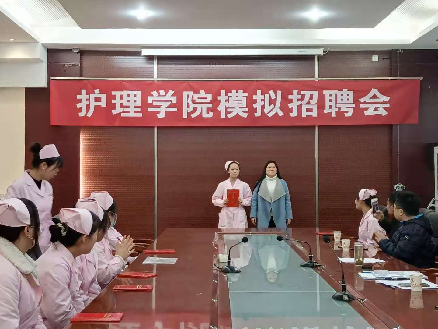 评委老师分别对应聘者个人简历、着装、语言表达、临场应变等进行了点评。马淑红同志肯定了同学们的临场表现,同时也给同学们提出两点希望:一是希望学生通过模拟招聘会了解企业招聘的过程,积累面试经验,认识到自己尚存的不足,明确接下来在学校真正的奋斗方向;二是希望同学们作为医务工作者,要锻炼自己具备实际操作能力、管理能力、人际沟通协调能力,提高随机应变能力,能更好的定位自我,规划好学业与就业目标,以获取更多的技能去面对未来的挑战。