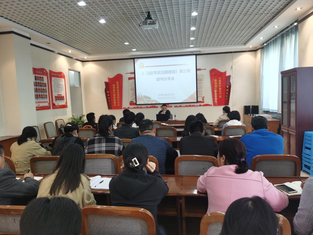 根据校党委安排,10月21日下午,澳门电子pg游戏官网党总支在医训楼南楼第二会议室召开了《习近平谈治国理政》第三卷读书分享会,我院全体党员同志参加了分享会。分享会由党总支副书记李晓乾主持。