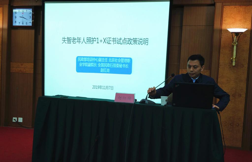 民政部培训中心主任、北京社会管理职业技术学院书记邹开来为大会致词。民政部培训中心副主任、北京社会管理职业技术学院副院长赵红岗教授从失智老年人照护职业技能等级证书的内涵、试点项目总体要求、工作进度安排、组织实施等方面介绍了1+X证书试点情况。他提出要准确把握“1”和“X”的关系,深化“放管服”改革,完善学历教育与职业培训并重的现代职业教育体系,健全育人和评价两个机制,形成产教融合、多元办学、协调开放共享的局面,推动“三教”改革。北京中民福祉教育科技有限责任公司CTO杨根来教授对培训考核的条件、考试站点有关制度文件进行了解读,说明了试点院校在实施1+X证书制度试点工作方面的内容。一是要统筹专业(群),推进“1”和“X”的有机衔接;二是要根据在校学生取证和社会需要,组织开展专门培训;三是符合条件的院校要按程序申请为考核站点,配合培训评价,组织实施证书考核;四是要管理、使用好有关经费。