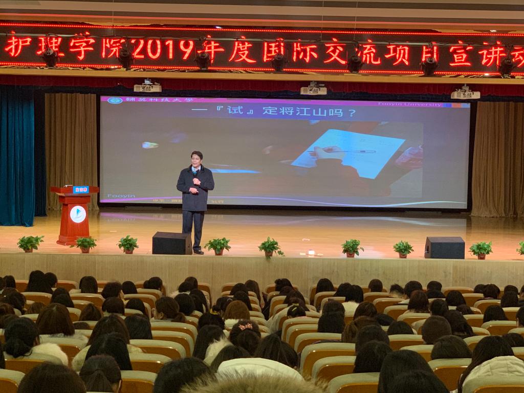 为拓宽学生实习就业渠道,提高学生职业素养,12月10日晚,澳门电子pg游戏官网在图书馆报告厅召开了2019年度国际交流项目宣讲会,我院党总支副书记马淑红,以及2018级高职全体学生参加了宣讲会。澳门电子对外交流与合作处的郑言老师、台湾辅英科技大学国际处副处长叶金鳞老师以及香港凤凰国际教育集团驻澳门电子pg游戏官网对外交流处日本项目负责人冯骊霞老师分别对各自的项目进行了介绍,我院辅导员李潮主持了宣讲会。