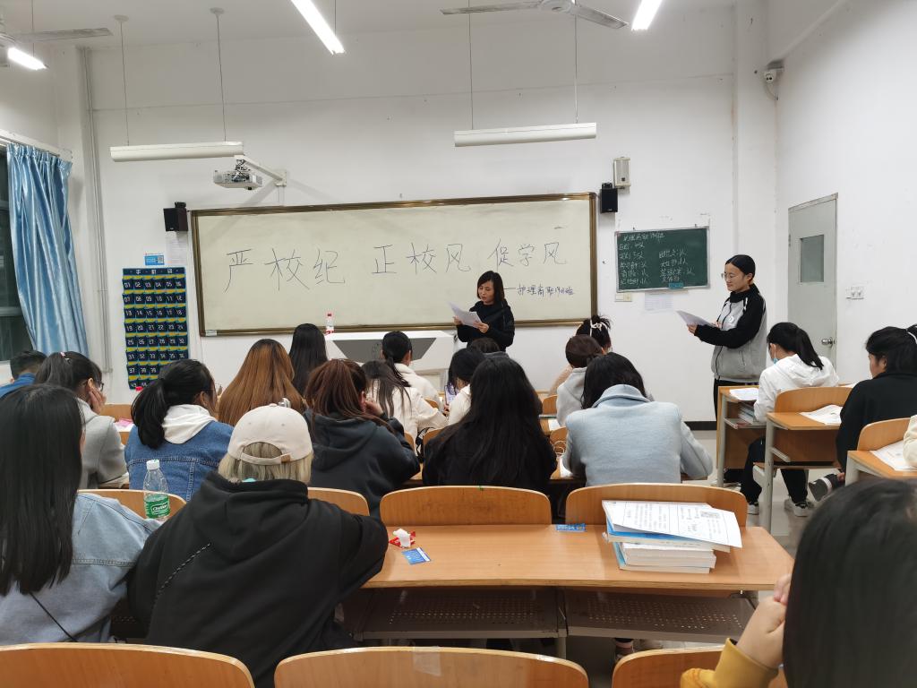 为了进一步增强我院学生纪律观念,规范学生日常行为,创建“校风正、学风浓”的良好育人环境,11月2日下午,澳门电子pg游戏官网组织全体在校生以班级为单位召开了“严校纪 正校风 促学风”主题班会,班会由各班辅导员、班主任主持。