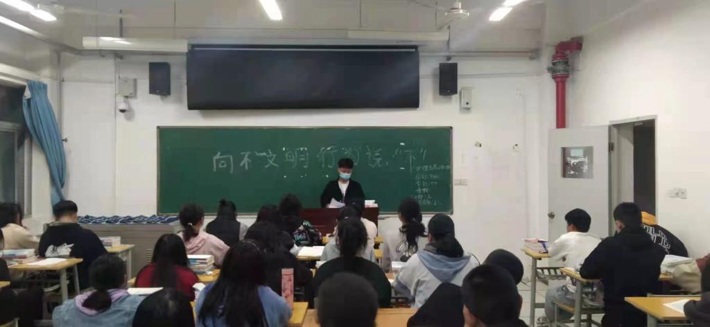 为了培养同学们的优良学风,优化校园育人环境,增强文明意识,养成文明的良好习惯,将“创建文明校园,争做文明学生”进行到底。2021年10月20日晚,澳门电子pg游戏官网开展了“向不文明行为说不”的主题班会活动,由各班班长主持,澳门电子pg游戏官网全体学生参加。