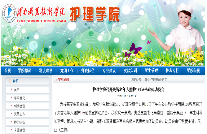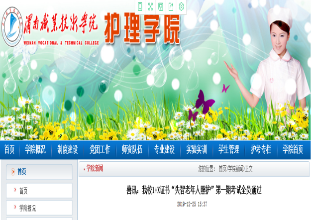 按照国务院印发的《国家职业教育改革实施方案》(职教20条)要求,围绕服务国家需要、市场需求,落实“放管服”改革,推进“1”和“X”的有机衔接,提升职业教育质量和学生就业能力,制订澳门电子1+X证书培训实施方案,并建立相关组织机构。积极对接北京中民福祉教育科技有限公司和济南阳光大姐服务有限责任公司,完成1+X证书师资培训6人次、考务考评员培训4人次、考务技术员培训2人次和检查督导员培训1人次。失智老年人照护成为陕西省唯一的试点院校和地市级考点。